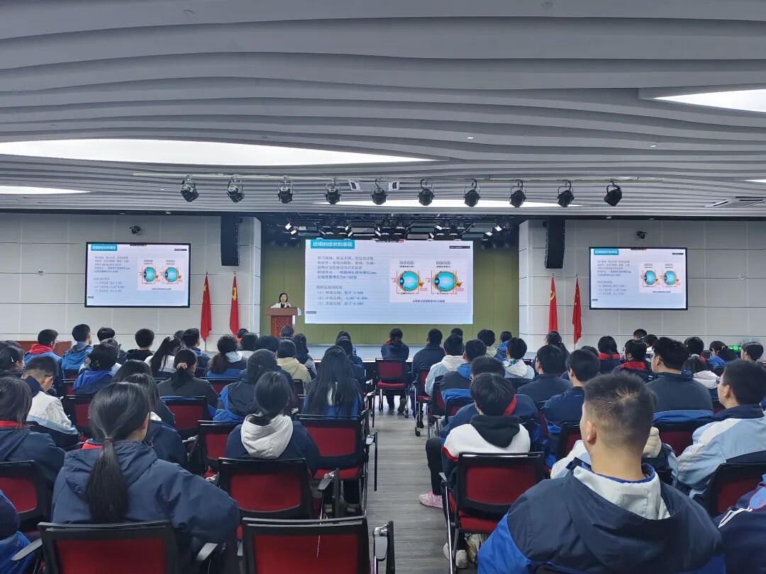随后,潍坊眼科医院屈光手术中心刘晶老师为学生们带来了精彩的眼健康知识讲座。她用生动有趣的方式,讲解了近视防控、眼睛保健、近视手术常识等知识,并针对寒假期间同学们户外活动减少、电子产品使用增多的特点,给出了针对性的护眼建议。